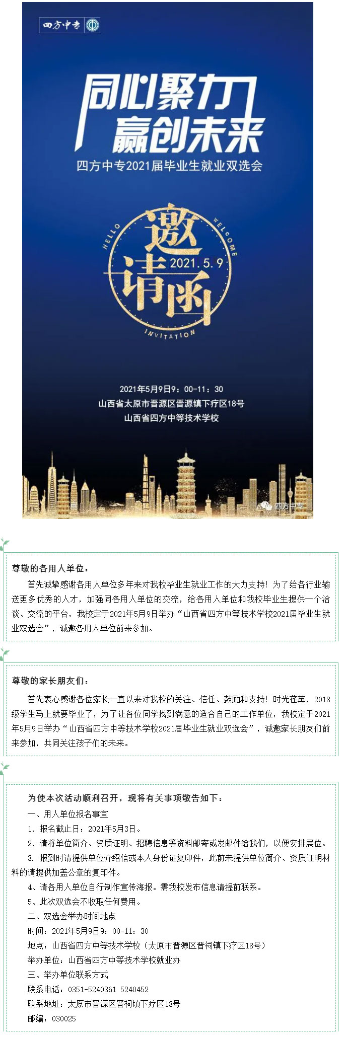 山西省四方中等技术学校2021届毕业生就业双选会邀请函