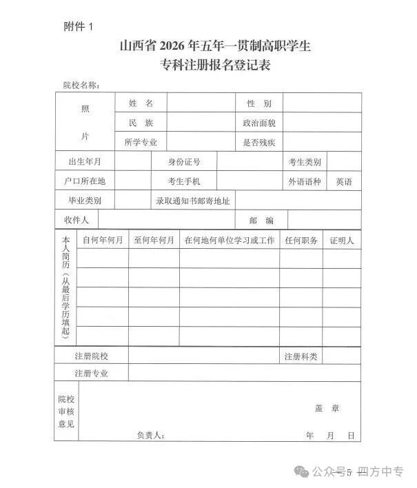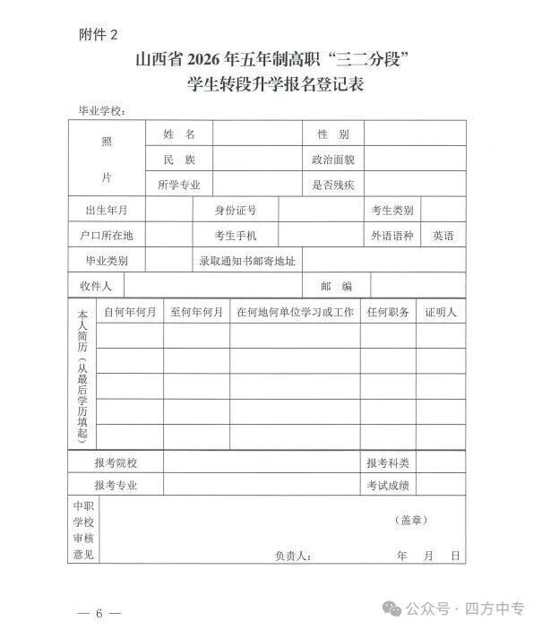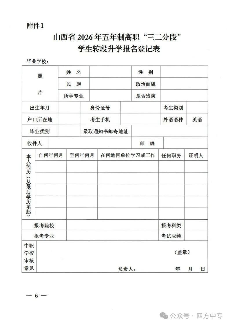 附件1:《山西省2026年五年制高职 “三二分段”学生转段升学报名登记表》
