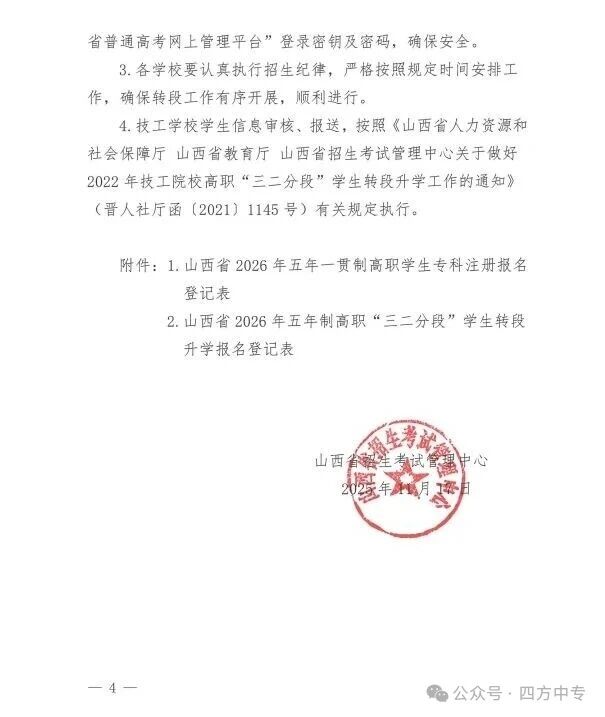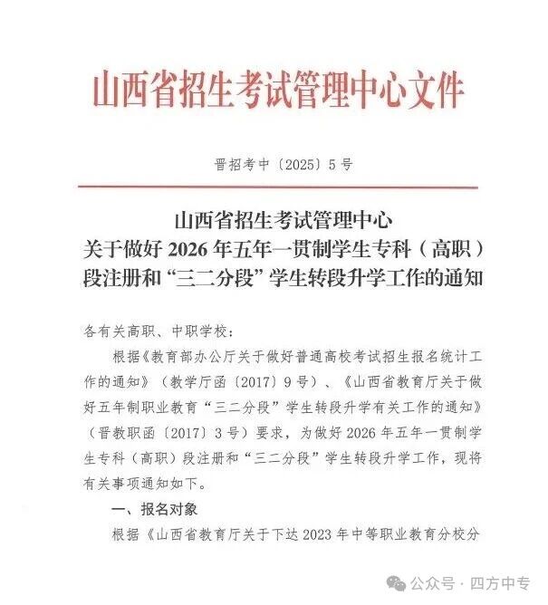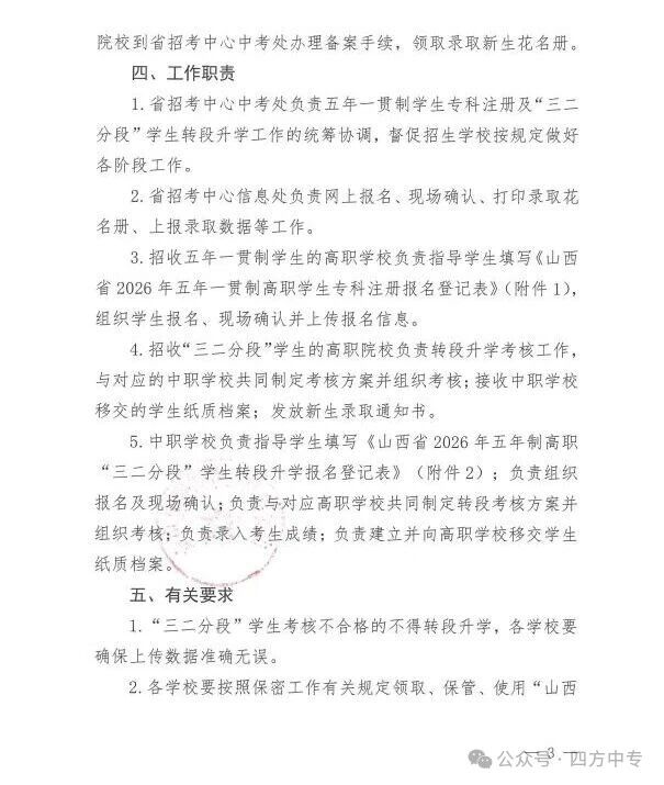 附件2:《山西省招生考试管理中心关于做好我省2026年五年一贯制学生专科(高职)段注册和“三二分段”学生转段升学工作的通知》