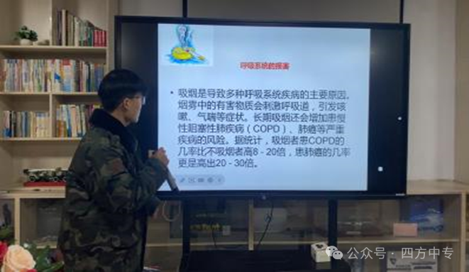 学生代表董伟军以详实的数据和生动的案例,系统讲解了烟草中的尼古丁、焦油等有害物质对人体呼吸系统、心血管系统及青少年大脑发育造成的严重损害,呼吁同学们珍爱健康,远离 支烟。