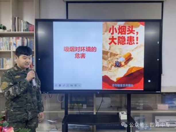 学生代表张国栋聚焦吸烟对环境的影响。他从烟头垃圾污染、二手烟三手烟对空气质量的破坏,讲到烟草种植与加工对自然资源的消耗,引导同学们思考个人行为与环境保护的密切关联。