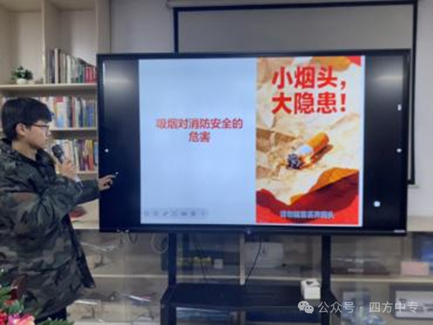 学生代表乔淼淼重点剖析了吸烟引发的消防安全隐患。他结合近年来因乱扔烟头、违规吸烟等行为导致的典型火灾案例,强调了微小的疏忽可能酿成的巨大灾难。讲述过程中,该同学同步播放了消防安全警示视频,视频中触目惊心的火灾现场和深刻的事故教训,给在场同学带来了强烈的视觉冲击与心灵震撼。