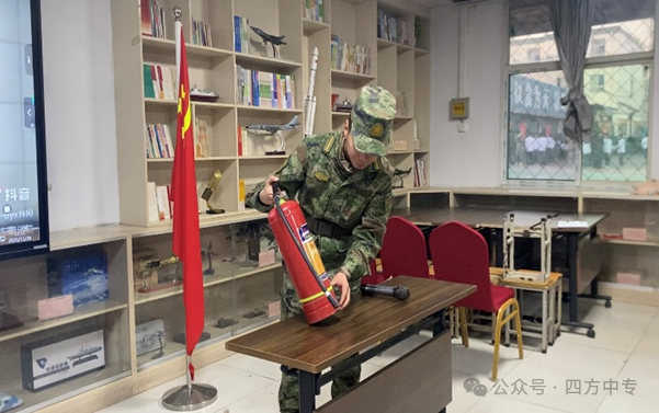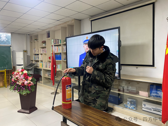 教官示范:系部刘教官现场讲解了干粉灭火器的构造原理、适用范围及操作要领,为同学们掌握技能提供了准确的操作范本。