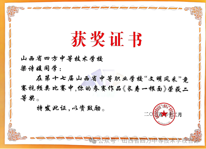梁诗媛同学《长寿一根面》荣获视频类二等奖