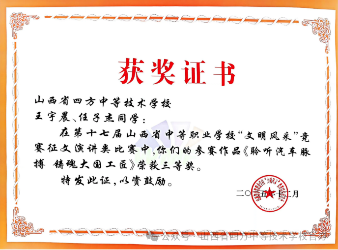 王宇晨、任子杰同学《聆听汽车脉搏铸魂大国工匠》荣获征文演讲类三等奖