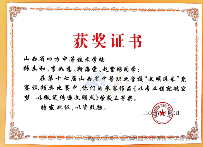 张志和、李如意、靳海棠、赵紫彤同学《以专业铸就航空梦以微笑传递文明风》荣获视频类三等奖