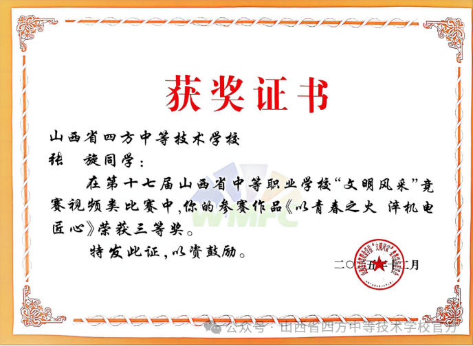 张旋同学《以青春之火淬机电匠心》荣获视频类三等奖