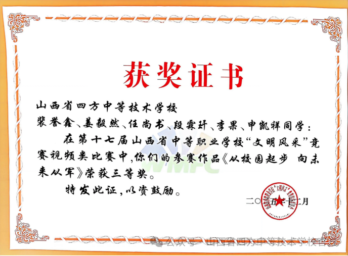裴誉鑫、姜毅然、任尚书、段霖玕、李果、申凯祥同学《从校园起步,向未来从军》荣获视频类三等奖